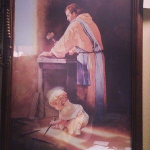 Joseph, the dad hard at work in his shop, with his son (Jesus) playing at his feet, bears the sash over the left shoulder of his tunic – the sash of a deacon.