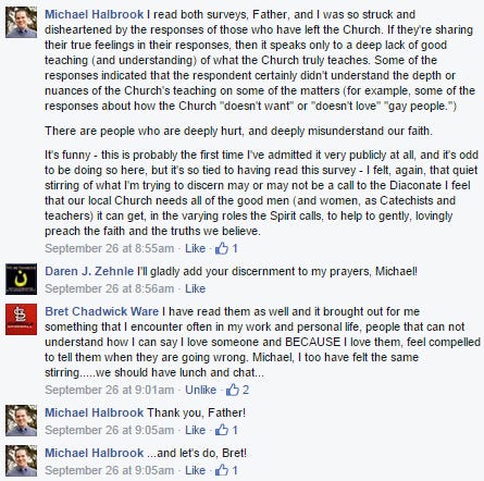 That said, a few weeks ago, a series of signs happened in my life (again.) First, this – a comment thread when a priest of our diocese posted a link to a study our diocese recently co-released with Benedictine University on why some Catholics stop practicing their faith, and why others remain: